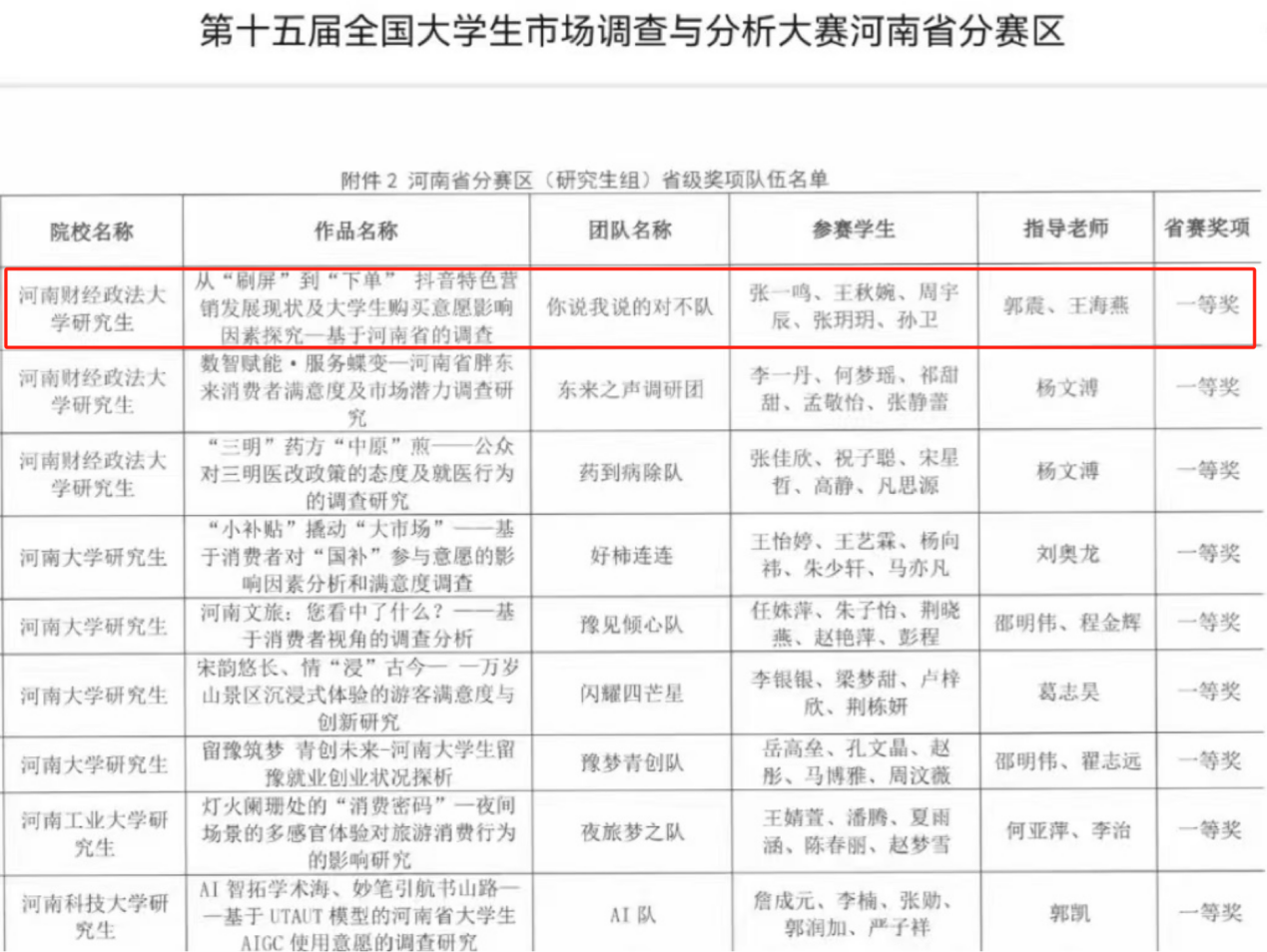 近日,由中国商业统计学会主办的“正大杯”第十五届全国市场调查与分析大赛(研究生组)河南赛区省赛成功落下帷幕,我院副院长陈卫华率队参加。经过激烈角逐,由我院研究生张一鸣、王秋婉、周宇辰、孙卫、张玥玥同学组成的团队经过郭震、王海燕两位指导老师的悉心指导,取得了省赛一等奖的佳绩。