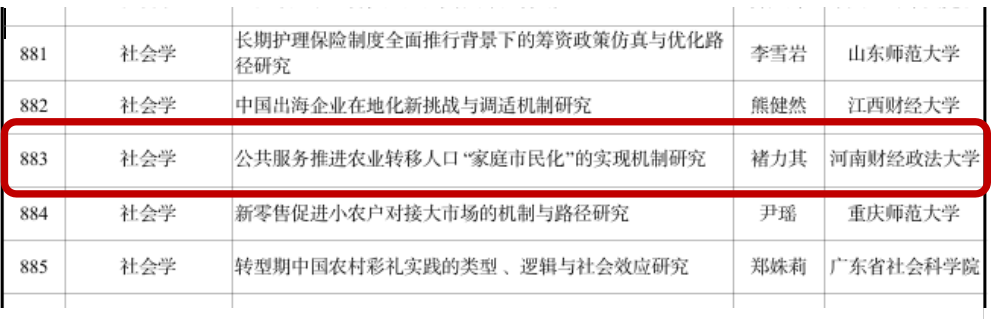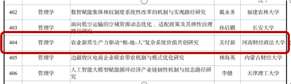 9月5日,2025年国家社会科学基金年度项目立项名单获准公示。我院关付新教授申请的《农业新质生产力驱动“粮-地-人”复杂系统价值共创研究》获得重点项目立项资助,褚力其博士申请的《公共服务推进农业转移人口“家庭市民化”的实现机制研究》获得青年项目资助。